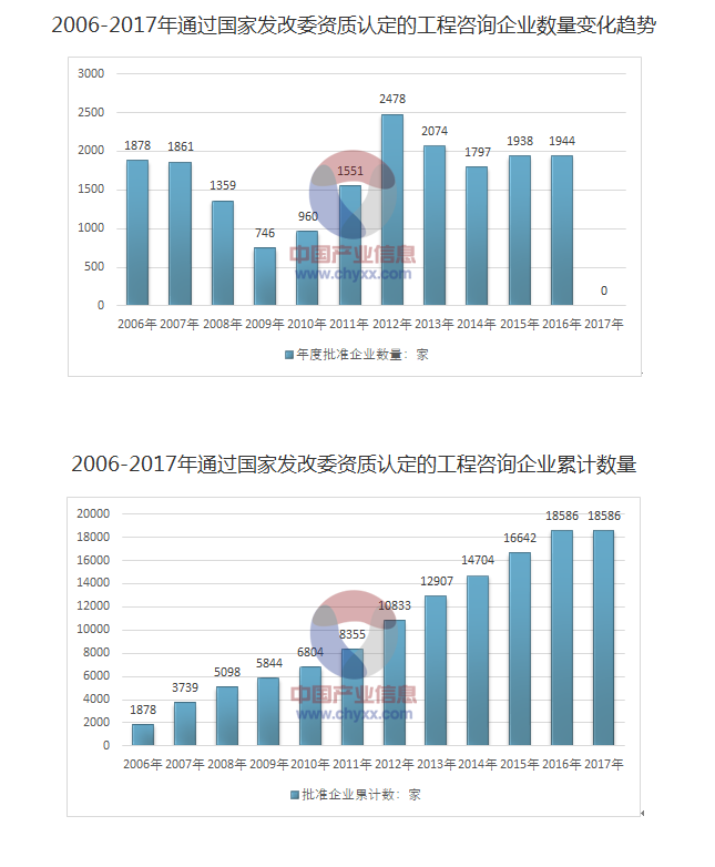 2006年開(kāi)始,國(guó)家發(fā)改委開(kāi)展工程咨詢單位資格認(rèn)定工作。2005年之前發(fā)改委原頒發(fā)的臨時(shí)級(jí)、預(yù)備級(jí)、丙級(jí)工程咨詢資格證書(shū)有效期截止至2005年12月31日,需要重新申請(qǐng)工程咨詢資格。持有正式甲、乙級(jí)工程咨詢資格證書(shū)的單位,2006年另行申請(qǐng)工程咨詢資格。因此此處統(tǒng)計(jì)口徑主要是2006年以來(lái)通過(guò)國(guó)家發(fā)改委資格認(rèn)證的工程咨詢企業(yè)。